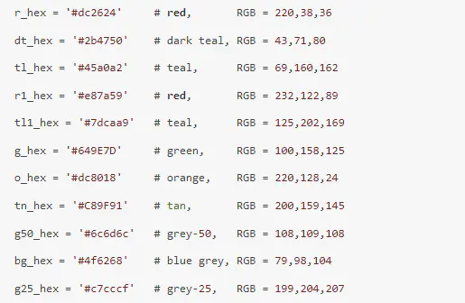 在画图中,个人偏好百度 Echarts 里面的一组颜色,因此将其 hex 颜色代码定义出来留在后面用。其中红色的 r_hex和深青色的 dt_hex是大爱。