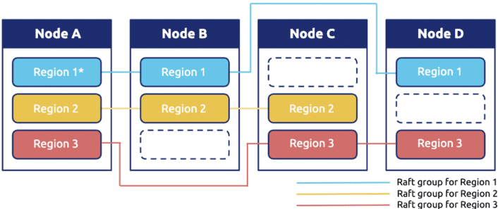 分布式数据库,顾名思义,数据一定是分散在不同机器上的。对于一张表的数据,我们会在逻辑上切分成若干个连续的区间,将这些区间内的数据分给不同的机器存储,不管是写入还是读取,只需要知道目标数据属于哪个区间,就可以直接到那个机器上进行访问。然后加上对每一个区间的数据在物理上做多副本冗余,实现高可用。如下图所示,Region 在 TiDB 的内部就是一个个连续的数据区间。