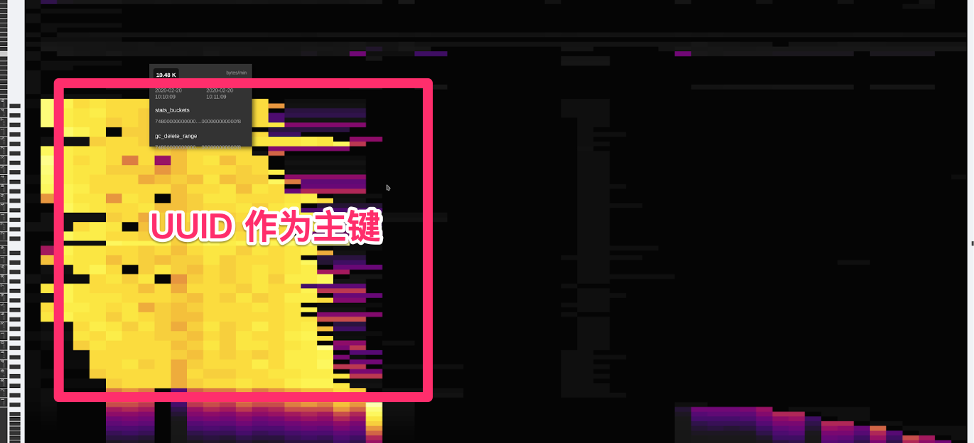 还是说回上面那个主键的小例子。对于两种不同的主键设计,KeyViz 这边是怎么表现的呢?看看下面两张图,是不是非常一目了然?