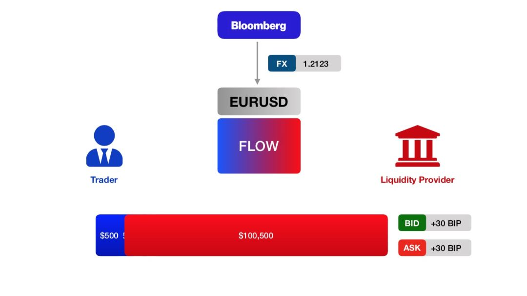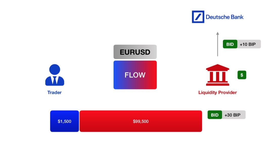 答案是在真实世界中,一个成熟的交易市场,流动资金提供者来获取这种流动性并不难。比如,欧元美元市场是一个每天以兆位计算单位计量的交易市场,因此,作为流动资金提供者,他们能够在当前的传统金融机构中获取这种流动性,并且能够以负担得起的方式来获取,流动资金提供者能因此获取一些价差。