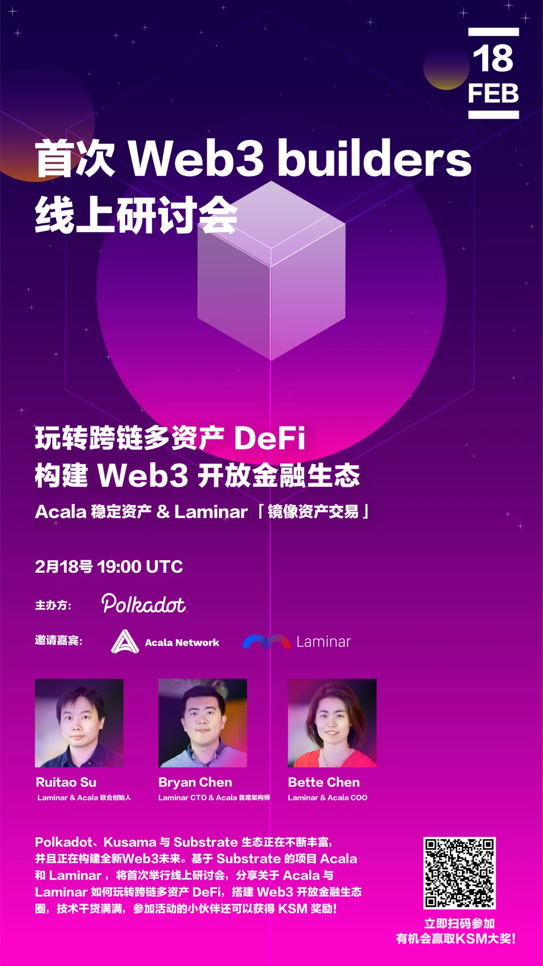 2月18日,Polkadot 举办首届 Web3 builders 线上研讨会, Laminar & Acala 联合创始人 Ruitao Su 、 Laminar CTO & Acala 首席架构师 Bryan Chen 、Laminar & Acala COO Bette Chen 受邀出席,分享了 Acala 稳定资产与 Laminar 「镜像资产交易」如何通过技术实现跨链多资产 DeFi ,未来将会有哪些应用场景,如何构建 Web3 开放金融生态等。