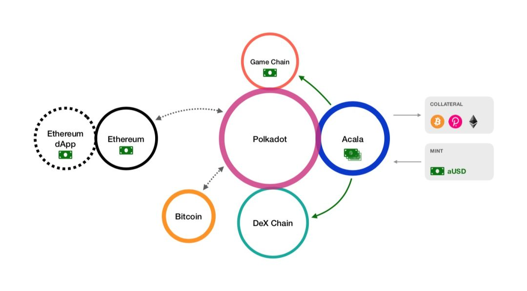 Acala 网络拥有完整的逻辑概念,譬如,我们可以不用外部资产来收取 aUSD 交易过程中所产生的费用,这对于一个完整的金融生态运作体系而言就显得十分合理。