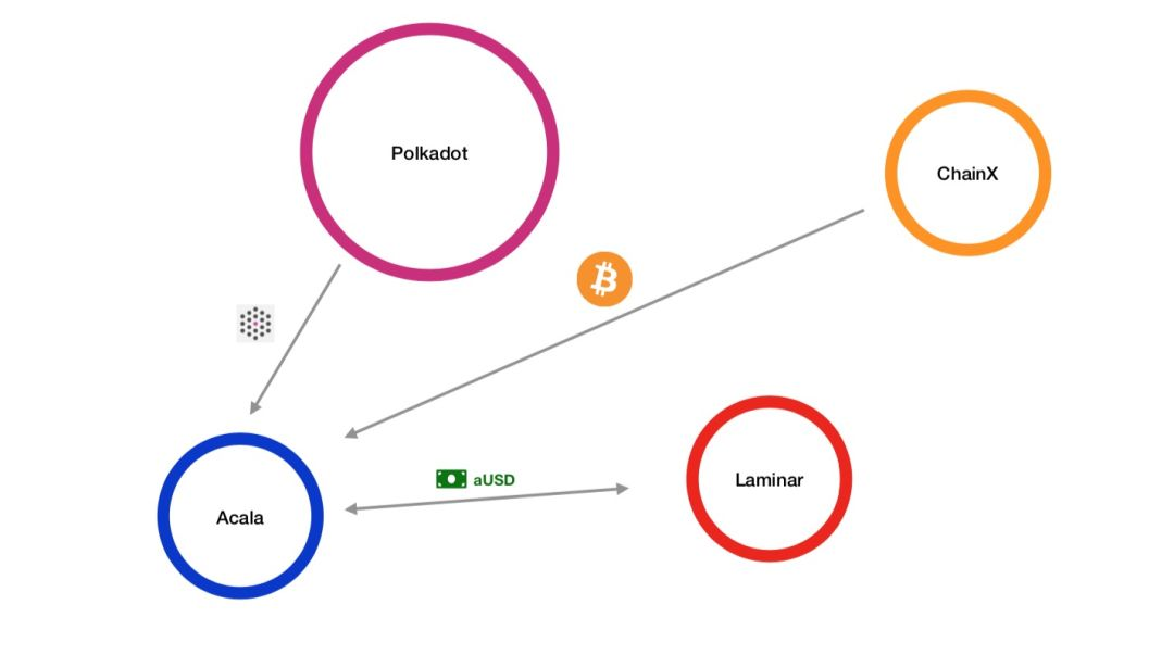 在以上两张图,我们可以看到 DOT 可以流通到 Acala 网络中作为资产的一部分,使用了 Homa 协议,会把 L-DOT 凭证以及 DOT 流向 Acala ,使其能进一步的在中心化的交易所中交易或是进行超额抵押生成稳定币。ChainX 作为 Acala 生态计划的伙伴之一,他们拥有的比特币可以流向 Acala 系统作为抵押资产,而在 Laminar 中,我们将会以稳定币 aUSD 作为交易对象。这些也只是交易场景中的一部分,未来将会看到更多的协同性能在 Acala 的生态系统中蓬勃发展起来。