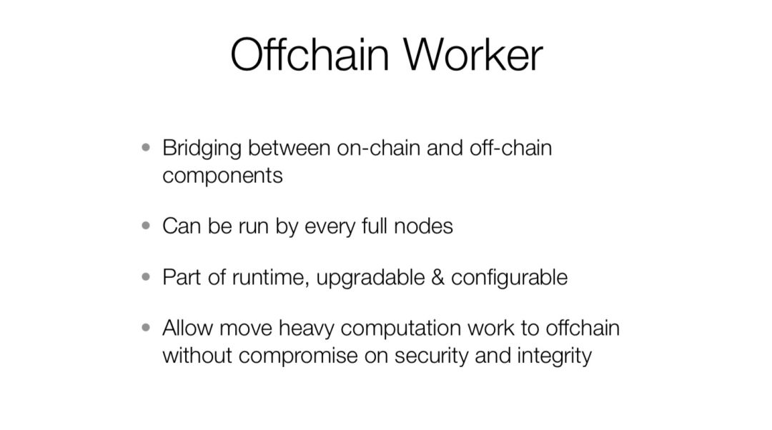 此外,Bryan 说到 Offchain worker 的一些特点,他指出 Offchain worker 能将链上和链下相互连接,所有节点都可以同步运行,这是 Runtime 层的模块之一,具备可升级性和可配置性,并且可将链上的大量的计算转移到链下进行完成,实现链上交易更链快速和轻量,让用户体验更好的同时实现安全性和交易数据更加完整。
