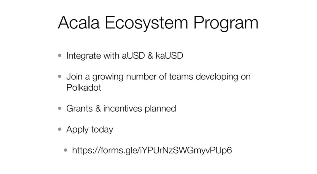 另外,Laminar & Acala COO Bette Chen 还展示了目前 Acala ecosystem Program 的成员,并列举了目前以下几点合作方向,当然看文章的你同样想要加入我们 Acala 生态,那么快点击此链接加入我们吧!