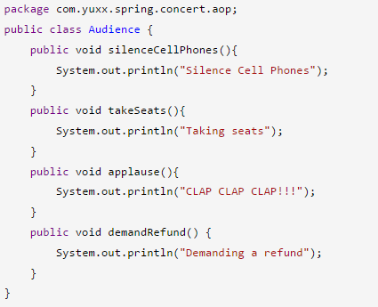 这次还用注解方式里的案例,但是把Audience类的注解去掉,就变成了一个极普通的POJO: