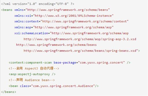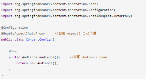 要想使用切面,需要将Audience类的bean加入到Spring上下文中,并开启自动代理功能,可以通过JavaConfig,也可以通过XML配置,根据实际情况选择。