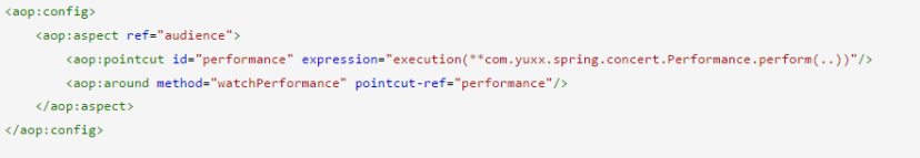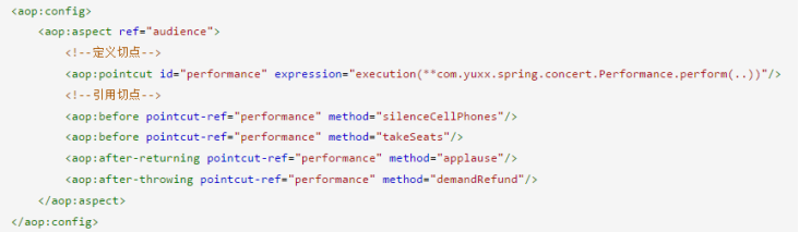 然后在XML中,通过Spring aop命名空间的一些元素,将这个普通的POJO转换为切面: