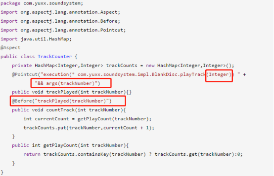 切点表达式中的 arg(trackNumber) 限定符。它表明传递 playTrack() 方法的 int 类型参数也会传递到通知中去。参数的名称 trackNumber 也与切点方法签名中的参数相匹配。