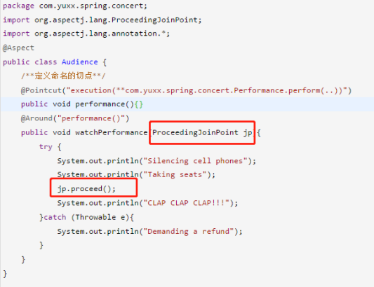 环绕通知方法,ProceedingJoinPoint 这个对象是必须要有的,因为你要在通知中通过它来调用被通知的方法。通知方法中可以做任何事情,当要将控制权交给被通知的方法时,它需要调用 ProceedingJoinPoint 的 proceed() 方法。