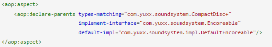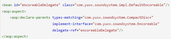 其中明显与注解方式里不同的是“types-matching”这个属性,它的属性功能正对应@DeclareParents注解里的value属性功能,表明新引进的接口目标类是谁。