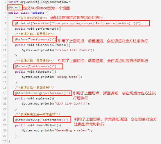 切点注解里包含一个切点表达式,这个表达式匹配到了一个具体的无参方法。下面定义的几个通知方法,都是围绕这个切点进行通知。例如silenceCellPhones() 方法,方法上注解了@Before,说明是一个前置通知。那么就会在切点表达式匹配到的那个方法被调用之前先执行,而后再执行切点方法。其他通知方法以此类推。