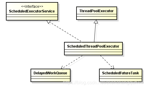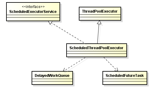 ScheduledThreadPoolExecutor继承ThreadPoolExecutor实现了ScheduledExecutorService接口, 依赖DelayedWorkQueue实现延迟和排序,依赖ScheduledFutureTask实现周期性执行任务。