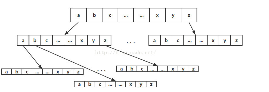 - 在Trie数实现过程中,我们发现了每个节点均需要 一个数组来存储next节点,非常占用存储空间,空间复杂度大,