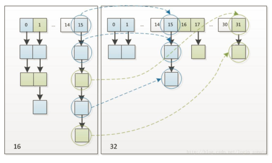 3.node.next有节点,说明node已经形成一个链表结构或者是红黑树结构,当e instanceof TreeNode,是一个树形结构的话,会通过 (e.hash & oldTabLength) 判断 是在老的索引还是新的索引,如果(e.hash & oldTabLength) ==0 则e 在老的索引,如果(e.hash & oldTabLength) ==1 则 e在新的索引,新的索引=[e.hash & (oldLength - 1) + oldLength], TreeNode<K,V> loHead = null, loTail = null;TreeNode<K,V> hiHead = null, hiTail = null; 分别存放 (e.hash & bit) == 0) 索引不改变的node节点,以及(e.hash & bit) == 1 新索引的node节点,然后再次通过 >UNTREEIFY_THRESHOLD(6)去判断是否需要继续构建成树形结构,如果节点数 >UNTREEIFY_THRESHOLD(6) 则通过treeify 构建成树形结构,如果小于 6, 则通过 untreeify 树形节点转为list链表。
