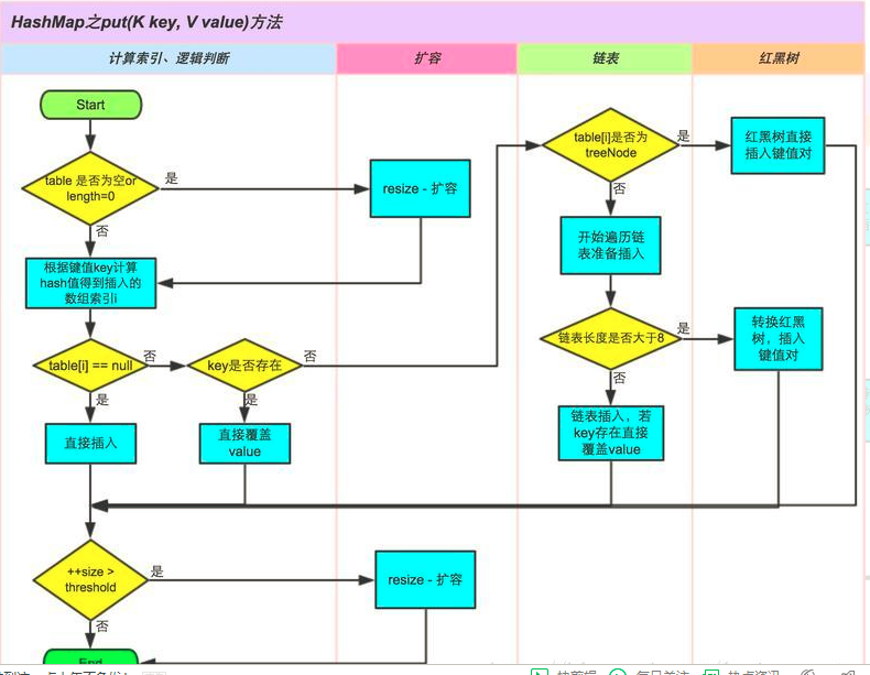 2.如果 table不为空数组,如果 key 进行 getIndex(key) 找到所在数组的索引位置,如果 table[index] == null,直接插入;如果key不存在,则判断 tbale[index]是否是treeNode 结构,如果是treeNode,则插入<K,V> 然后进行balanceTreeNode 平衡二叉树;如果不是treeNode,插入键值对 判断链表长度是否 >8 如果 >8,则treeify() 链表转为红黑树,如果插入的时候 key有一样的,则覆盖原来的value,并将原来的value return;最后modCount++,判断新增元素后的table[]的长度是否 > threshold [是否需要扩容]。