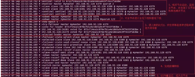 通过上述几个关键概念,可以基本了解哨兵的工作原理。为了更形象的说明,下图展示了领导者哨兵节点的日志,包括从节点启动到完成故障转移。