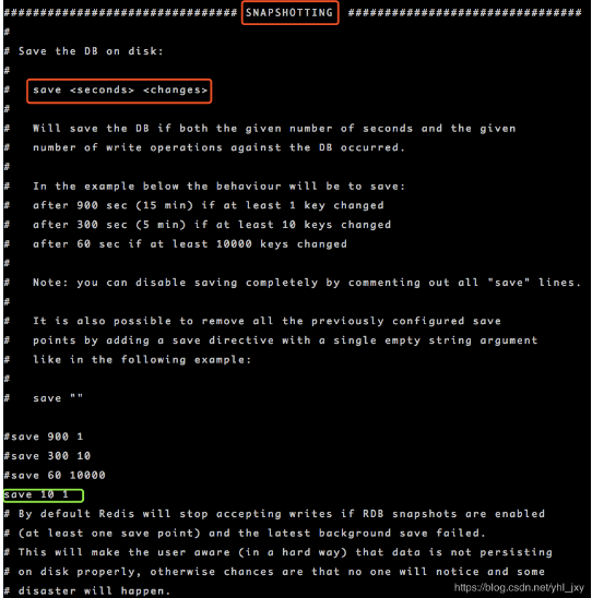 比如,save 10 1,即10秒内,发生至少一次变动,则自动保存一次数据快照。