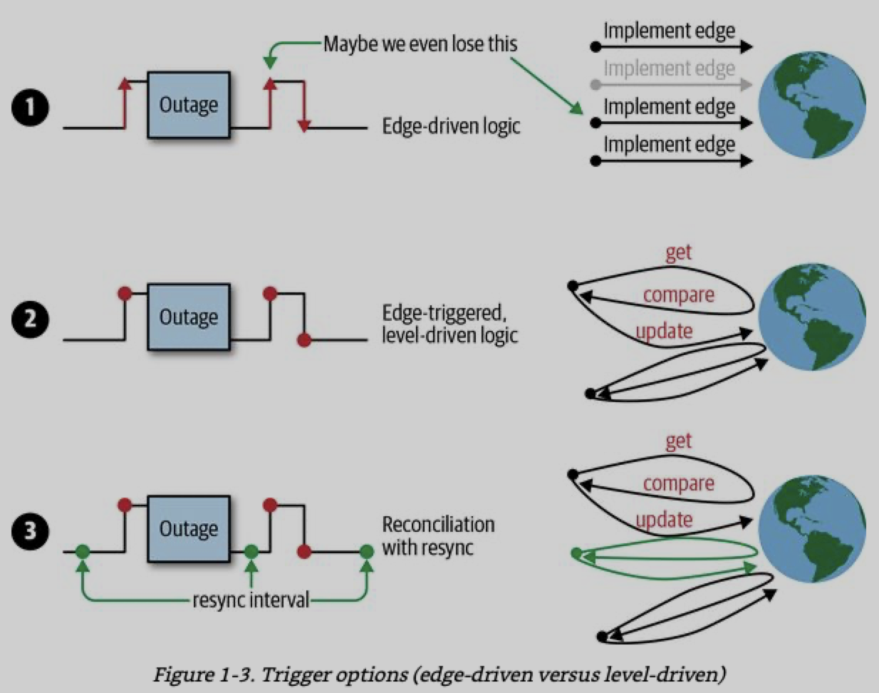 前者效率更高,延迟则依赖在控制器处理事件时,运行的工作线程。因此k8s基于事件驱动,即edge-driven triggers.
