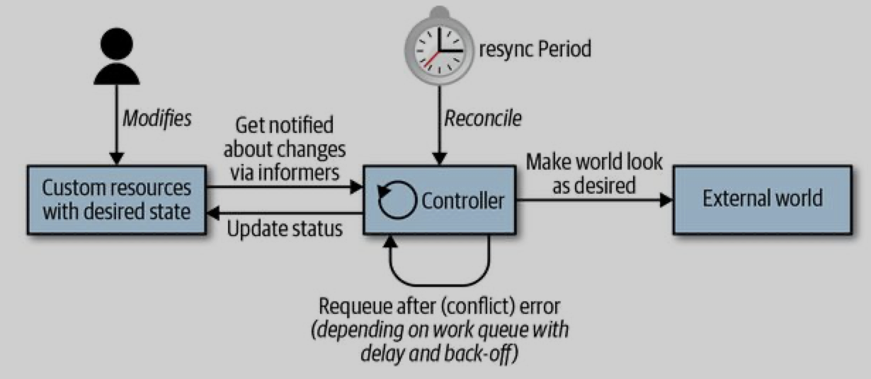 不管controller的实现复杂与否,这三步骤都是一致的。读取资源状态->改变the world-> 更新资源状态。