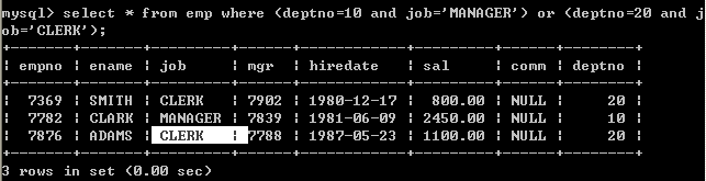 找出部门编号为10的所有经理,和部门编号为20的所有办事员的详细资料。
