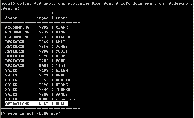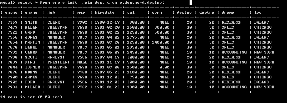 左外连接:以左表作为基准(左表中的数据必须全部显示,右表中和左边有关的数据才显示,无关的数据不显示)