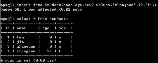 十二、给student表插入zhansan这个学生信息,性别与age不使用默认值