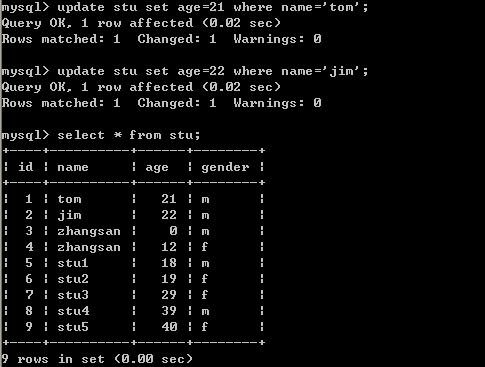 二十五、修改tom的age为21,jim为22岁
