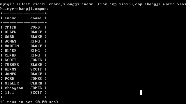 列出所有员工的姓名及其直接上级的姓名。