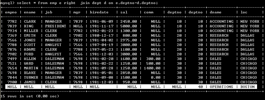 右外边接: 以右表作为基准(右表中的数据必须全部显示,左表中和右边有关的数据才显示,无关的数据不显示)