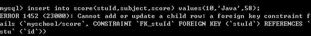 二十、再添加一条10号学生的java成绩(其实这个学生在stu表中根本不存在,我们用此操作引发的错误来验证联合主键与外键)