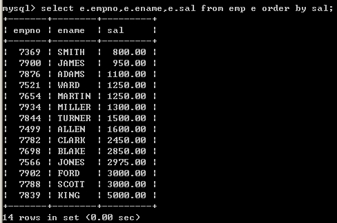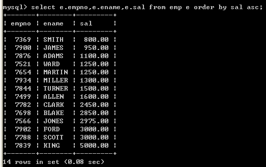 查询所有员工记录,按sal升序排序