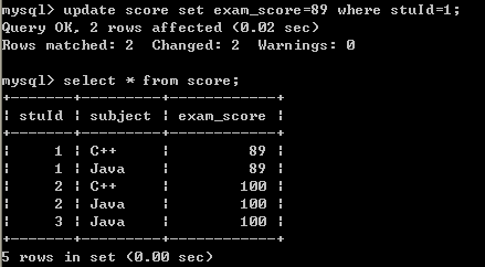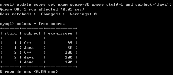 二十二.修改1号学生C++,Java考试成绩都为89