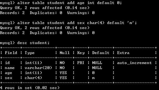 十、给student表添加两列:age和sex,age默认值为0,sex默认值为’m’