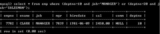 找出部门编号为10的所有经理,和部门编号为20的所有销售员的详细资料。