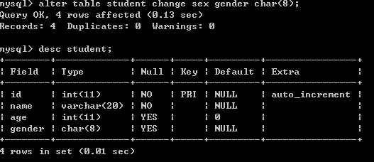 十三、修改sex列的类型由char(4)改为char(8)