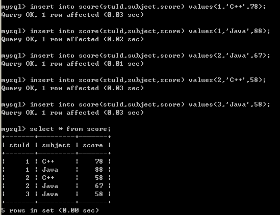 十九、给score表添加四行数据,分别是tome,jim,zhangsan的C++和Java考试成绩