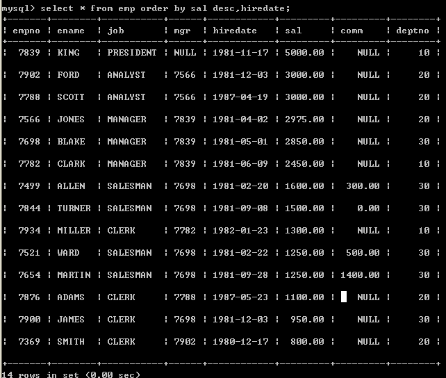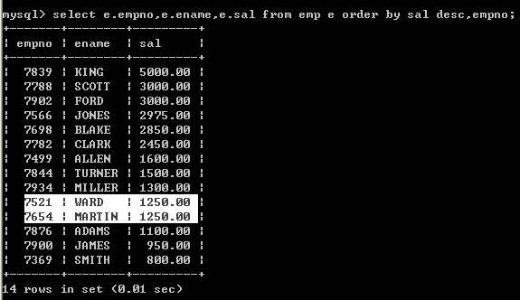 查询所有雇员,按月薪降序排序,如果月薪相同时,按编号升序排序