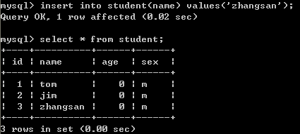 十一、给student表插入zhangsan这个学生信息,性别与age都使用默认值