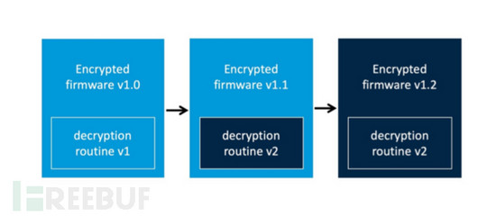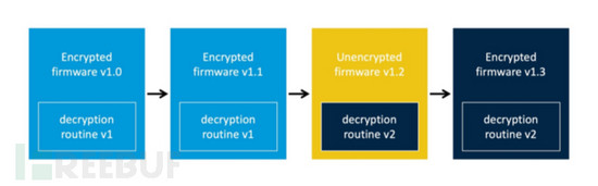 设备固件在原始版本中加密。但是,厂商决定更改加密方案,并发布包含新版解密程序的未加密转换版本。