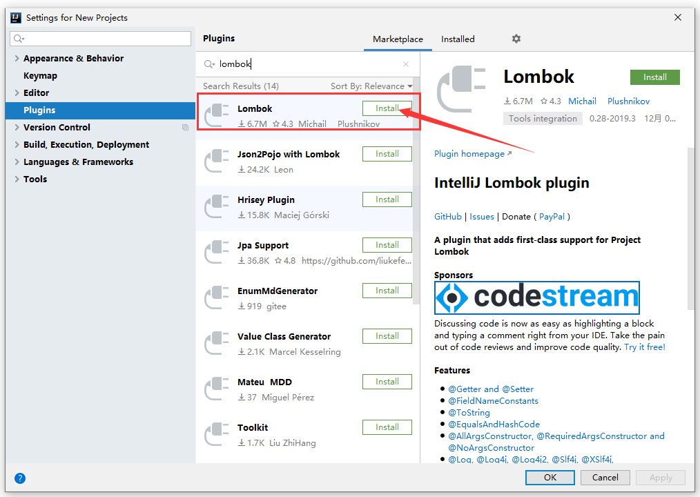 选择左侧菜单【Plugins】,在右侧面板中,搜索【lombok】,在搜索结果中选择并安装。安装成功后,按提示重启 IDEA