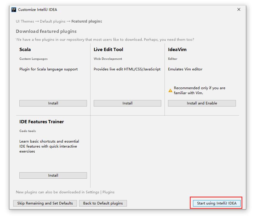 根据需要选择安装插件,这里我就都不安装了,直接点击 Start using Intelij IDEA 按钮: