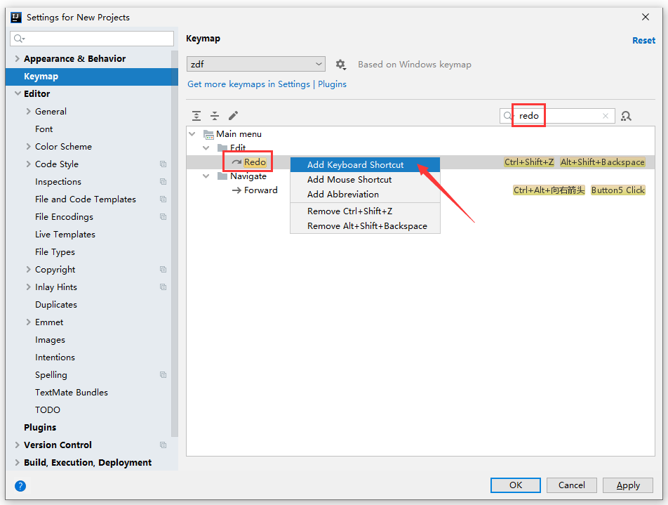 配置 重做 快捷键: 在搜索框中输入 redo 以筛选相关的设置,然后在 Redo 菜单上鼠标右键,选择 Add Keyboard Shortcut 可以添加键盘快捷键:
