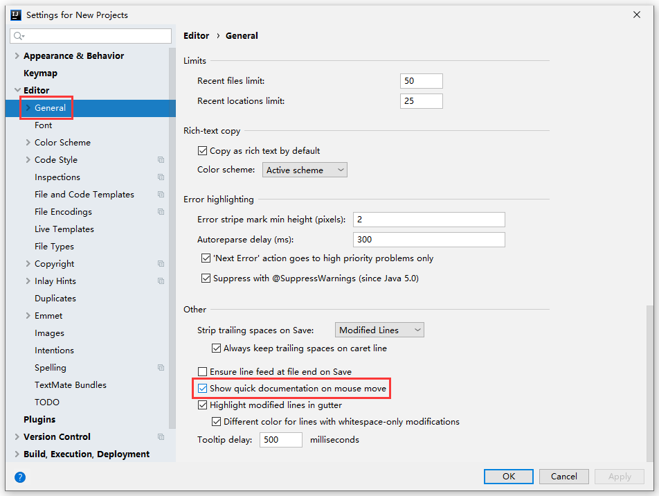 选择左侧菜单【Editor】- 【General】,然后在右侧面板滚动到最底部,勾选【Show quick documentation on mouse move】