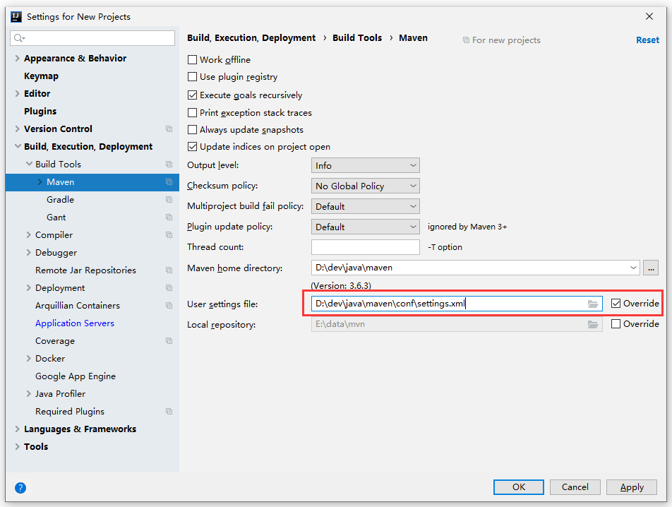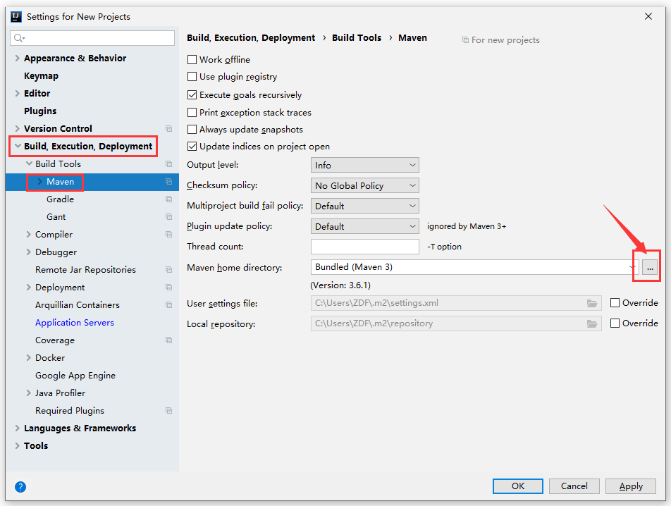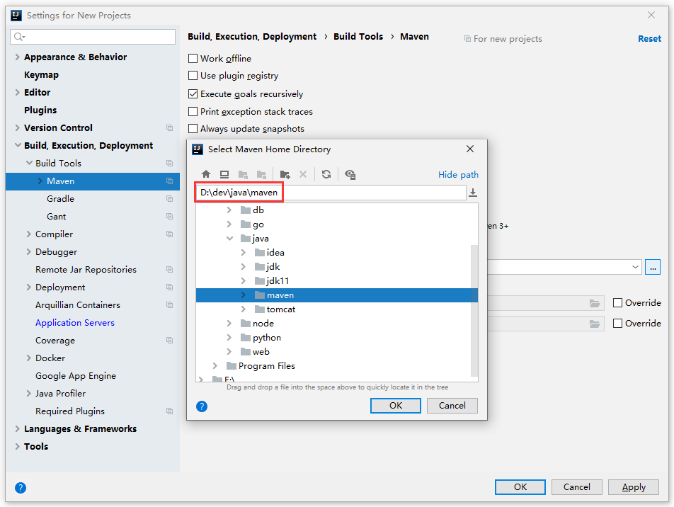 选择左侧菜单【Build, Execution, Deployment】- 【Build Tools】,然后点击【Maven home directory】选择Maven目录
