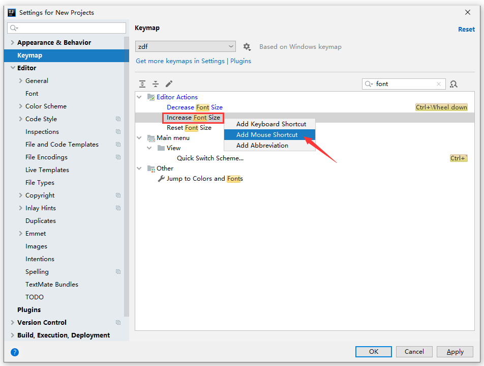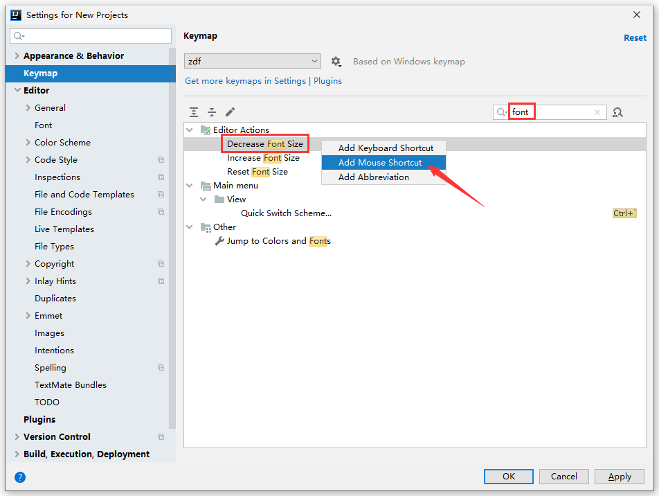 配置通过鼠标滚轮放大、缩小字体快键键:在搜索框中输入 font 以筛选和字体相关的设置,然后在 Decrease Font Size 菜单上鼠标右键,选择 Add Mouse Shortcut 可以添加鼠标快捷键: