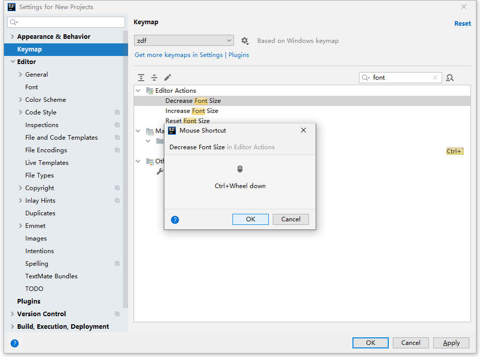 Decrease Font Size 为缩小字体操作。按住键盘上的 Ctrl 键不放,同时鼠标滚轮向下滚动。IDEA会识别出你的设置,点击 OK 按钮保存设置。