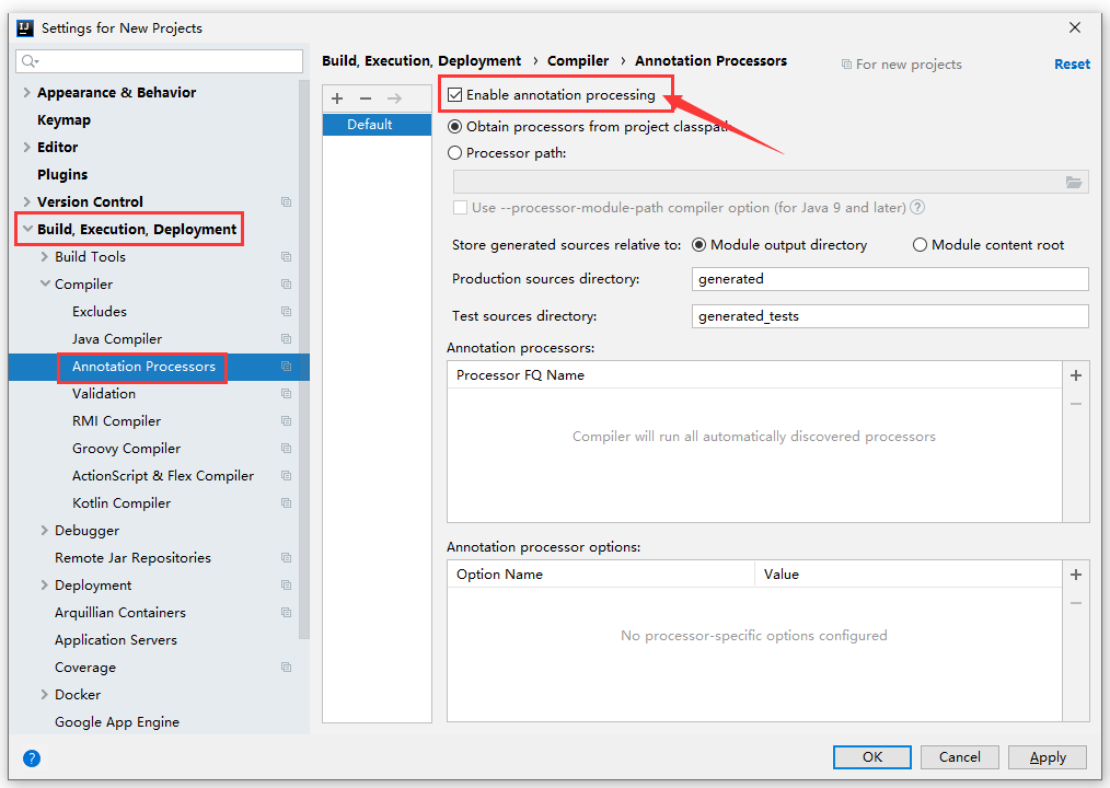 重启后,再次打开设置菜单。选择左侧菜单【Build, Execution, Deployment】- 【Compiler】 - 【Annotation Processors】,然后在右侧面板中勾选【Enable annotation processing】复选框