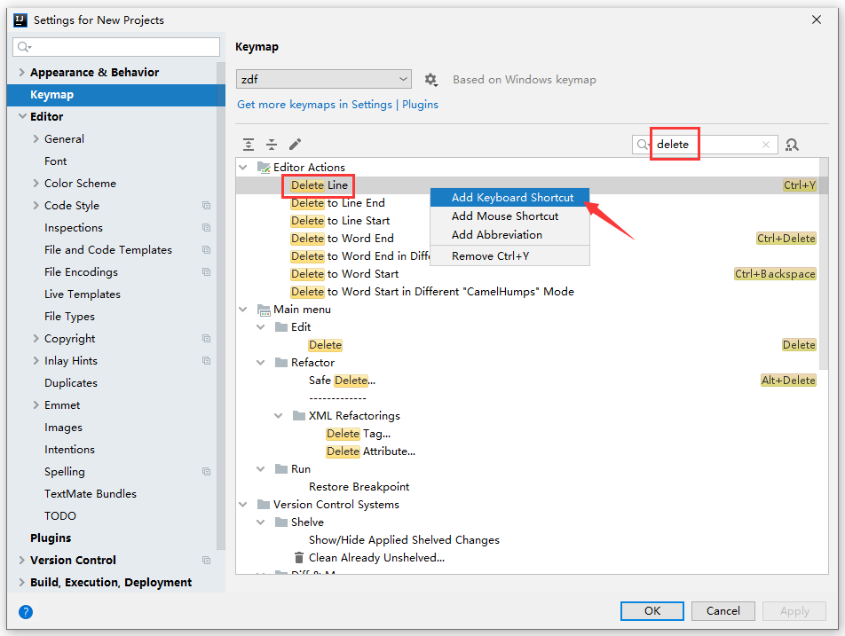 配置 删除整行代码 快捷键: 在搜索框中输入 delete 以筛选相关的设置,然后在 Delete Line 菜单上鼠标右键,选择 Add Keyboard Shortcut 可以添加键盘快捷键: