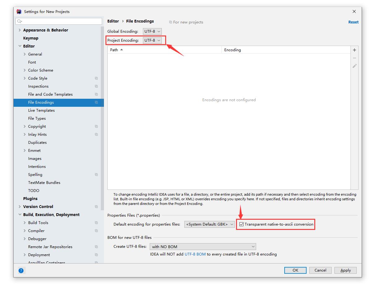 选择左侧菜单【Editor】- 【File Encodings】,将【Project Encoding】设置为 UTF-8 ,在底部勾选 Transparent native-to-ascii conversion 复选框